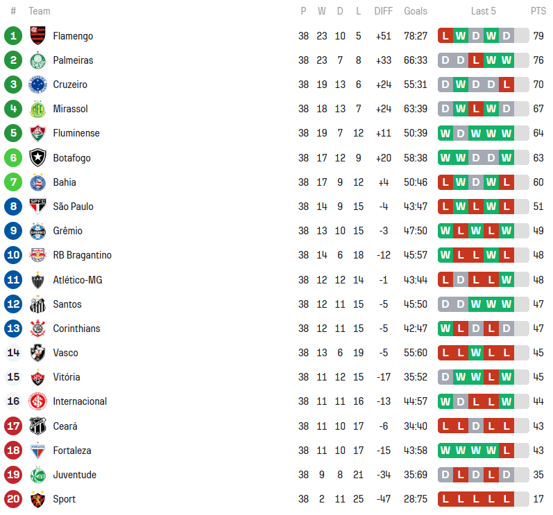 虎扑12月08日讯 2025自然年巴甲的所有比赛在今晨全部结束。桑托斯在末轮主场3-0完胜克鲁塞罗,最终拿到了联赛第12名,他们不仅完成保级还成功晋级到下赛季的南美杯;本轮开始前身处降级区的巴西国际也在末轮3-1击败布拉甘蒂诺红牛,最终名列第16名惊险完成保级。