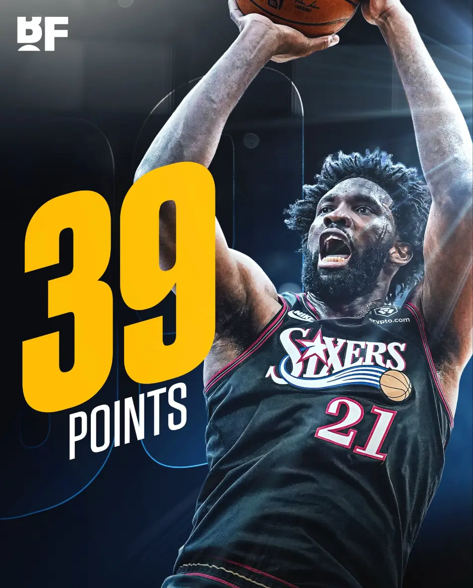 费城官方晒出恩比德39分的海报写道:这个夜晚恩比德的状态很好。