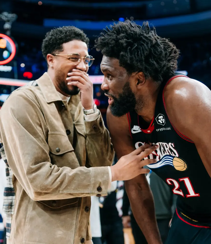 除此之外恩比德还跟因为跟腱大伤赛季报销的哈利伯顿相谈甚欢,很多球迷觉得这一幕略显暧昧,难道这两人在密谋些什么?