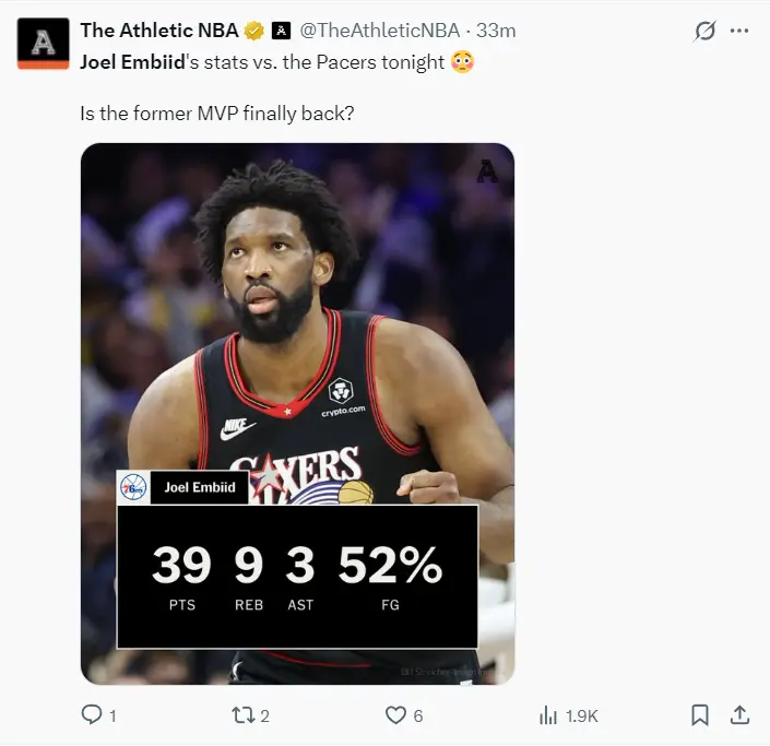 北京时间12月13日,费城115-105大胜步行者。这场比赛费城真正意义上的领袖泰雷斯-马克西伤停,恩比德、乔治两个病号可以登场,最终这两人都拿到20+的数据,而且大帝爆砍39+9打出了赛季最佳一战,也是时隔19个月的最佳一战。