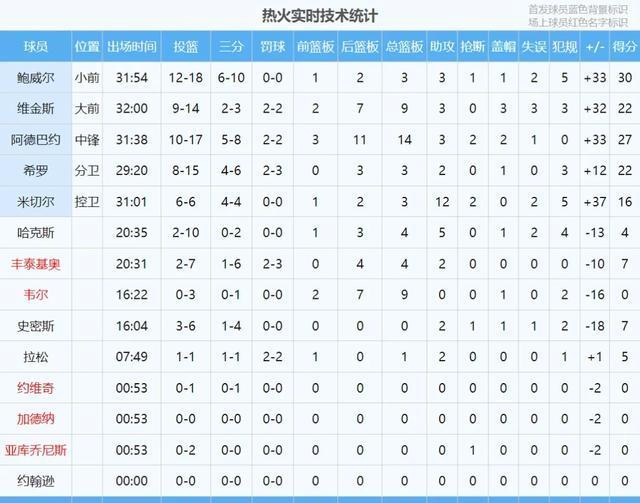 鲍威尔18投12中,0罚球砍下30分3篮板3助攻。阿德巴约27分14板3助2断2帽、维金斯22分9板3助3帽、希罗22分3板2助。最后看看数据: