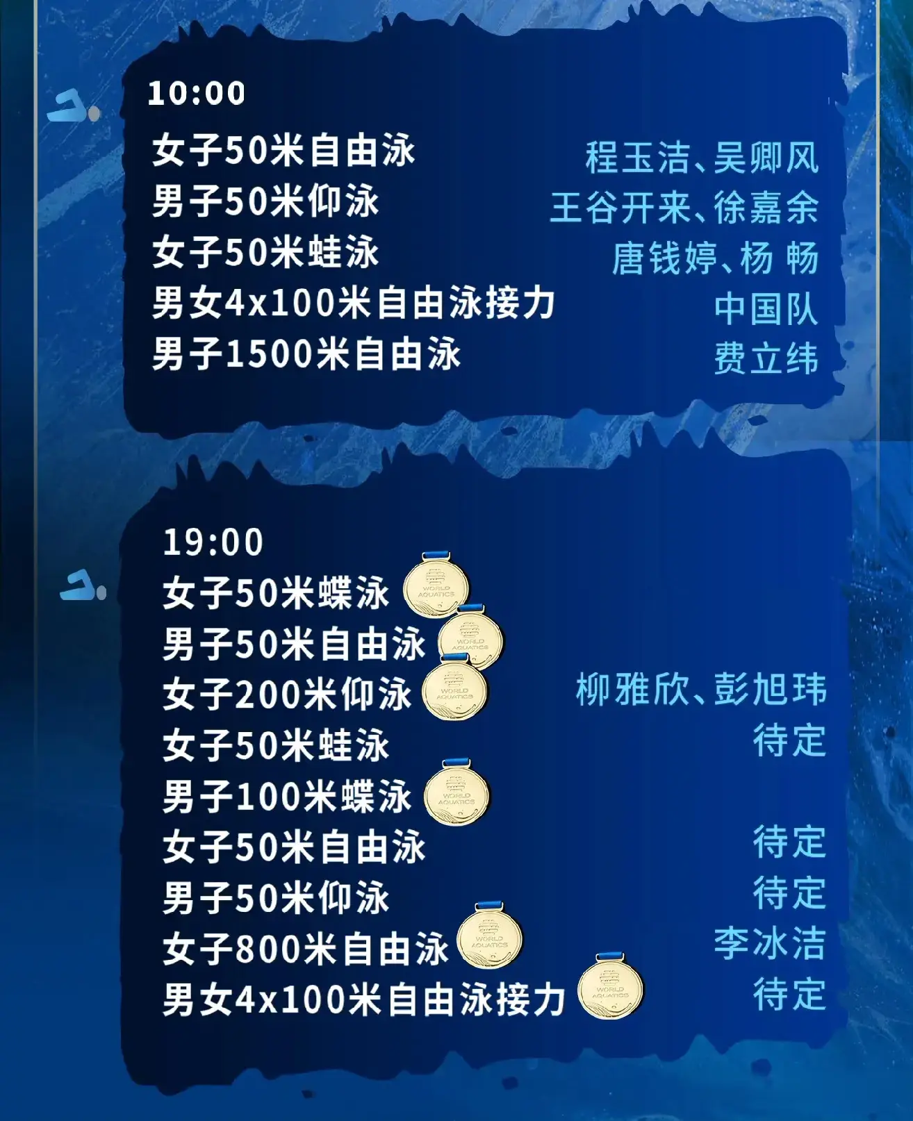北京时间2025年8月2日,2025新加坡世界游泳锦标赛继续进行,比赛进入尾声,8月2日也迎来了金牌最多的一个比赛日,一共将产生7枚金牌,分别是跳水项目女子3米板跳水;游泳项目女子50米蝶泳、男子50米自由泳、女子200米仰泳、男子100米蝶泳、女子800米自由泳和男子4x100米自由泳接力。中国代表团将参与其中的4个项目的金牌争夺,8月2日能拿多少奖牌让我们一起拭目以待。