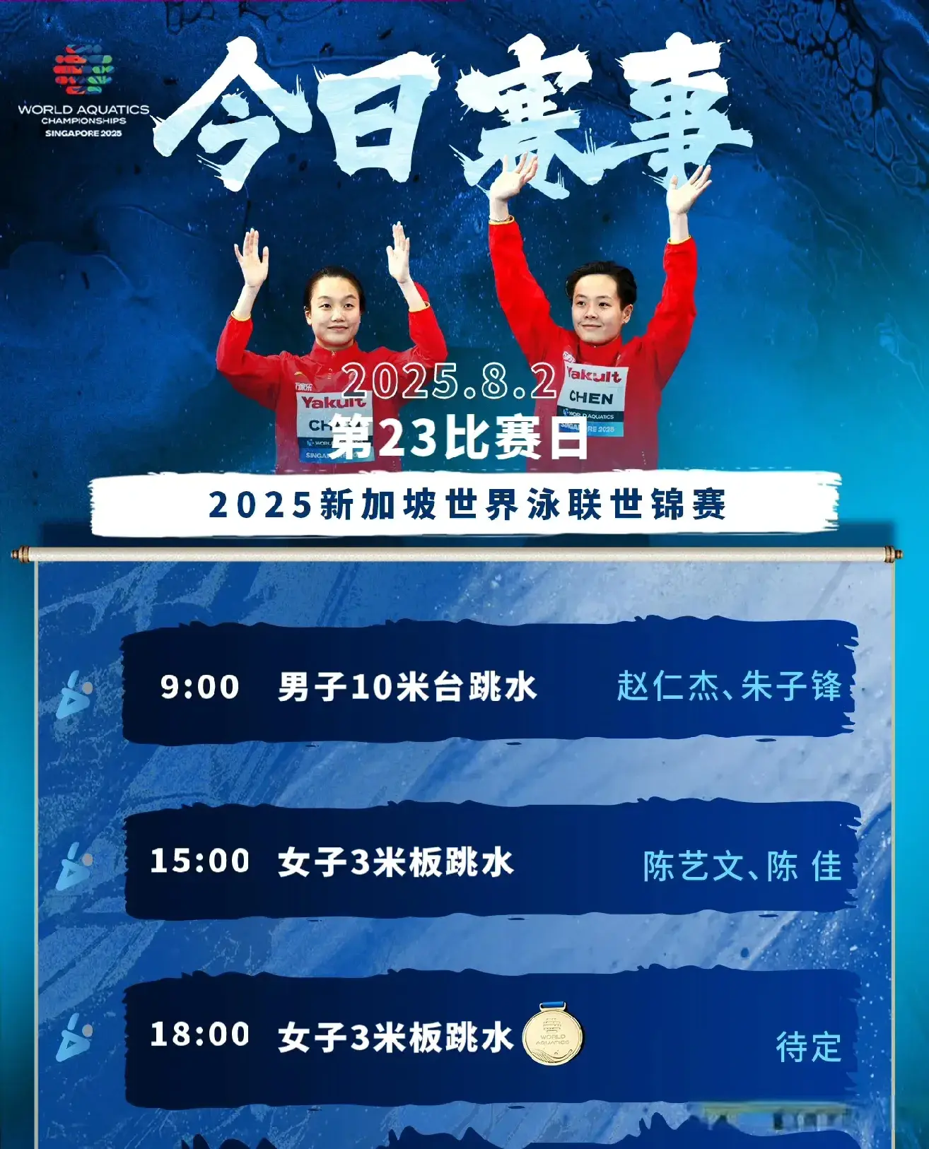 首先在跳水项目中,虽然在昨天的男子单人3米板跳水中,中国跳水队奥运冠军王宗源、曹缘双保险的情况下仅收获银牌和铜牌,但跳水项目中国代表团还是金牌最有力的争夺者,本届新加坡游泳世锦赛中国跳水队已经斩获了8枚金牌,女子单人3米板中国跳水队陈艺文、陈佳将再次向金牌发起冲击,不出意外,这枚奖牌将是中国代表团的第15枚金牌。