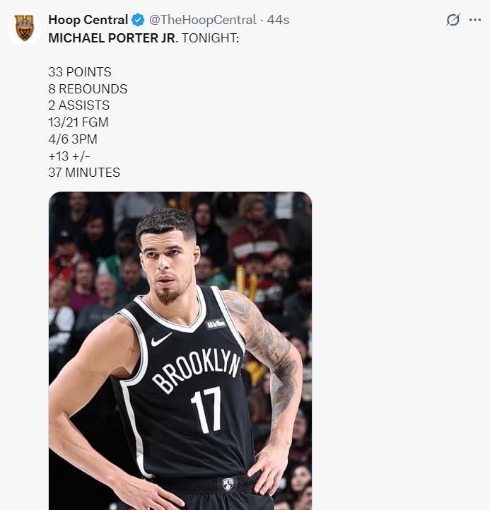 全场比赛37分钟,21中13,三分6中4,罚球5中3,拿到33分8篮板2助攻,命中率61.9%,三分命中率66.4%,小波特完成连续八场20+是生涯最长,而且小波特登场14次已经5次拿到30+生涯最多,过去两年158场比赛合计才5次30+。