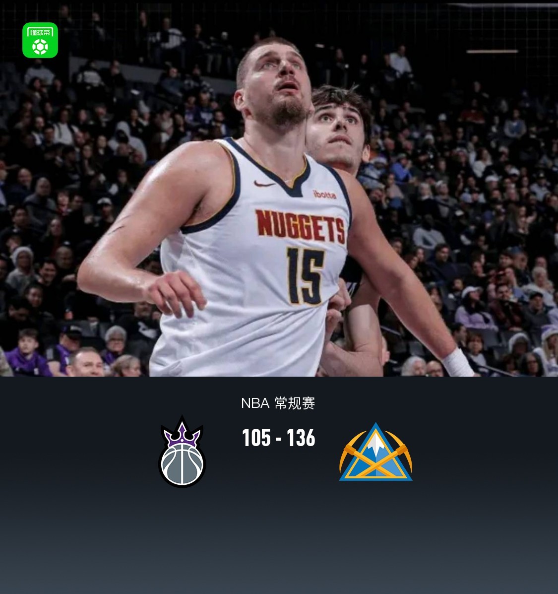 第四节,双方提前收兵换下主力,掘金始终保持30分上下分差,全场结束,掘金136-105国王。