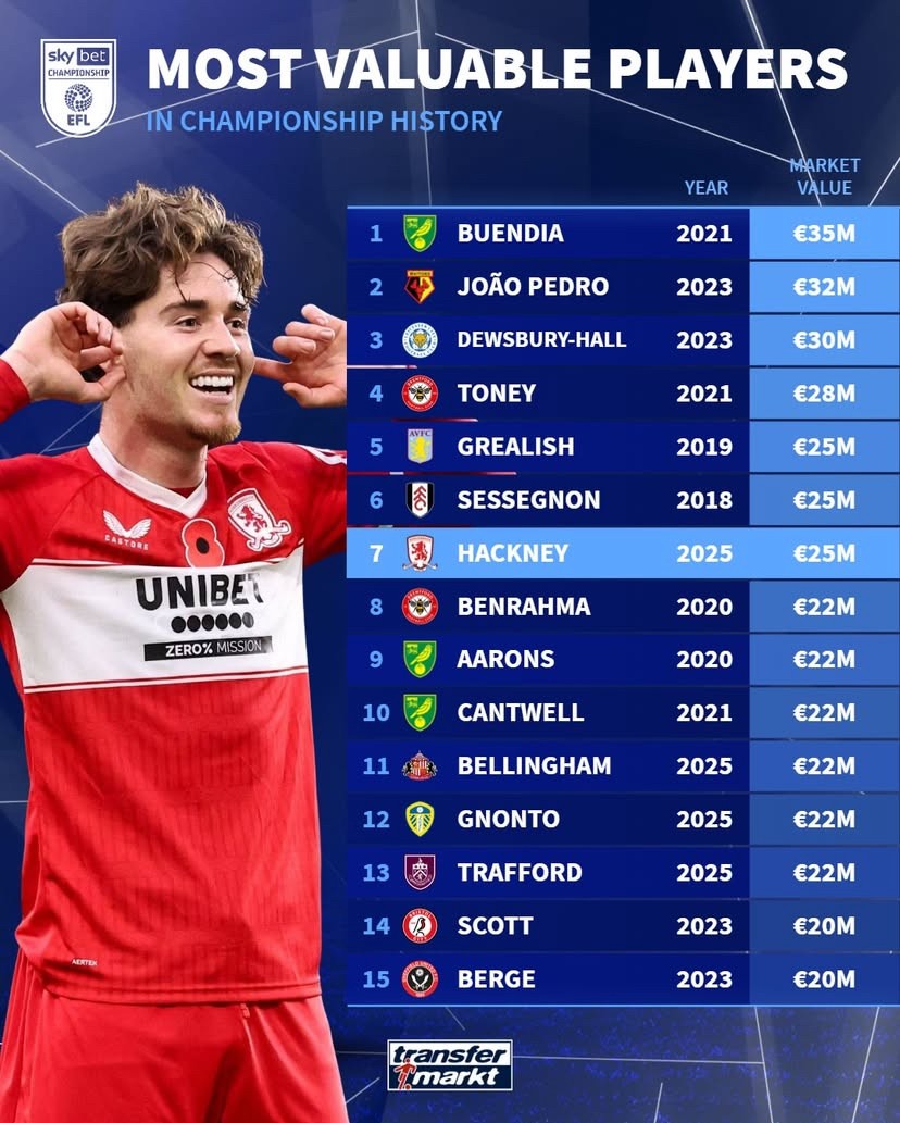 北京时间12月3日,在更新了英冠球员的身价之后,德转还列出了英冠历史身价最高的15名球员,2021年效力于诺维奇的布恩迪亚以3500万欧元排名第一,2023年效力于沃特福德的若昂-佩德罗3200万欧元排名第二,此外迪尤斯伯里-霍尔、伊万-托尼、格拉利什、乔布-贝林厄姆、尼奥托以及特拉福德也都榜上有名。