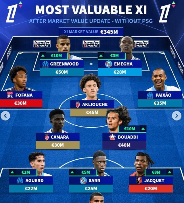 德转今日更新了法甲球员的最新身价,并列出了一套没有巴黎球员的最贵阵容,格林伍德领衔,布阿迪在列。