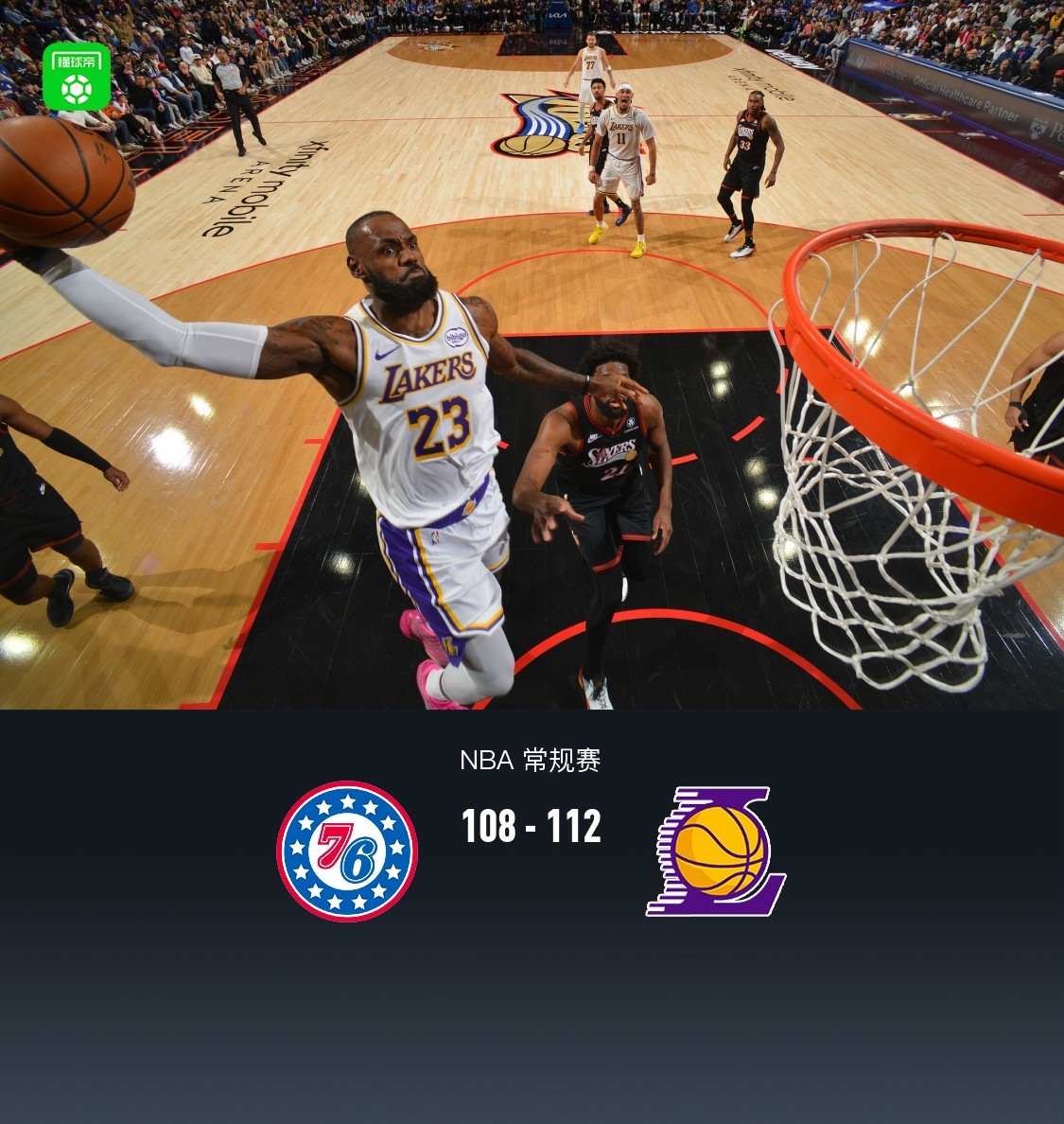 第四节,开节段湖人詹姆斯带队,文森特率先三分命中,紧跟76人恩比德连得4分追至2分分差,湖人艾顿、八村垒回应再度领先6分,紧跟76人马克西站出来持续冲框再度追至2分,后半节东契奇回来,双方拉锯湖人保持微弱领先,随后詹姆斯连续中远投领先至5分,比赛来到最后3分钟关键时刻,湖人里夫斯、东契奇相继进攻不中,76人格莱姆斯率先三分,紧跟恩比德中投追平比分,随后湖人詹姆斯站出来中远投连得5分再度领先,随后76人连续前场板马克西三分续命,湖人东契奇两罚全中领先4分,还剩最后4.2秒,詹姆斯直接抢断彻底杀伤比赛,全场结束,湖人112-108险胜76人。