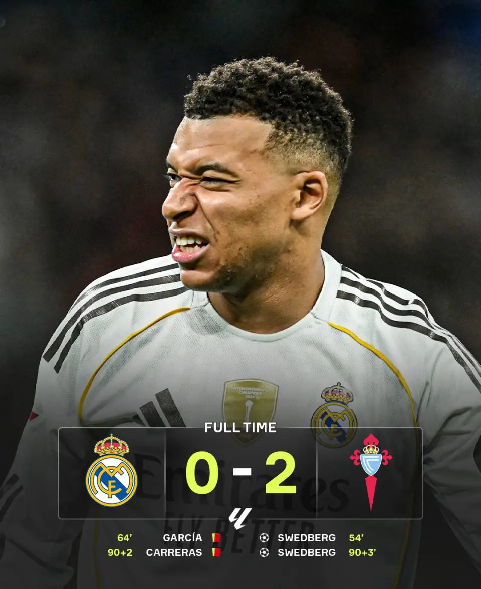 补时阶段,阿斯帕斯送出精准直传,斯维德贝里将球趟过库尔图瓦推射破门,梅开二度,最终塞尔塔2-0爆冷皇马,是这双方近23次锋中,皇马首次败北,同时本赛季主场全胜纪录终结。最近5轮联赛,皇马只赢了一场,阿隆索的压力达到执教巅峰级别。