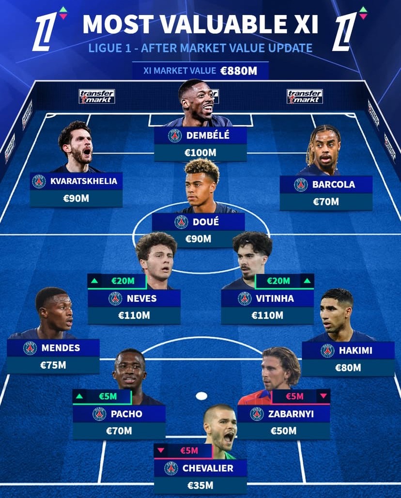 北京时间12月15日,在更新了法甲球员的身价之后,德转列出目前法甲最贵的11人阵容,巴黎圣日耳曼包揽11人,若昂-内维斯和维蒂尼亚以1.1亿欧元的身价领衔,登贝莱1亿欧元身价在列。