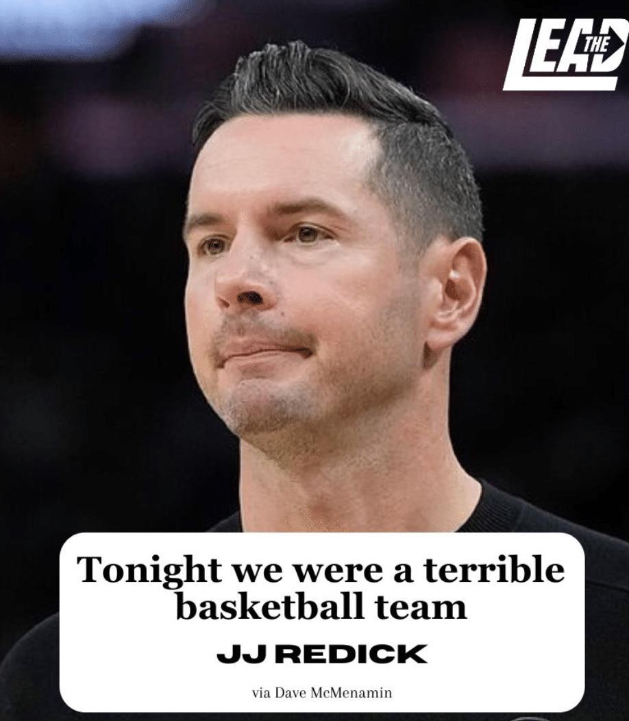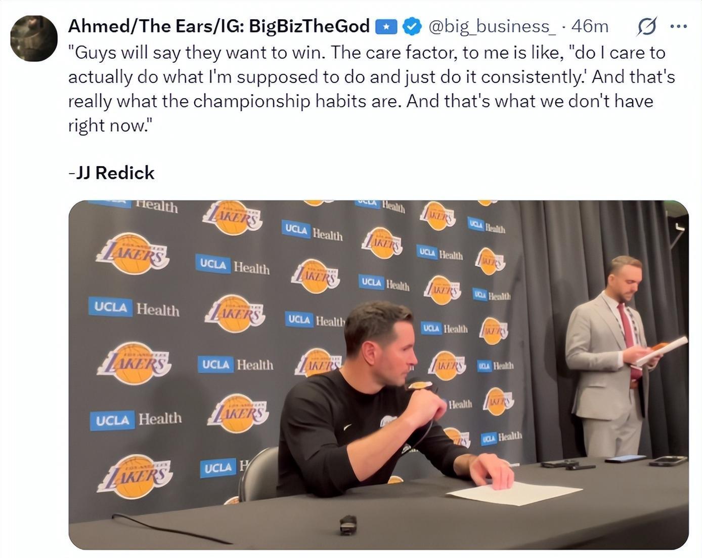 赛后雷迪克对湖人全队的表现特别的不满,他透露在湖人输给太阳后刚刚才进行了一场令人不太舒服的复盘/录像分析,以解决球员在场上漫不经心、不退防、不轮转等问题,但这场比赛湖人全队依旧跟复盘之前一样。