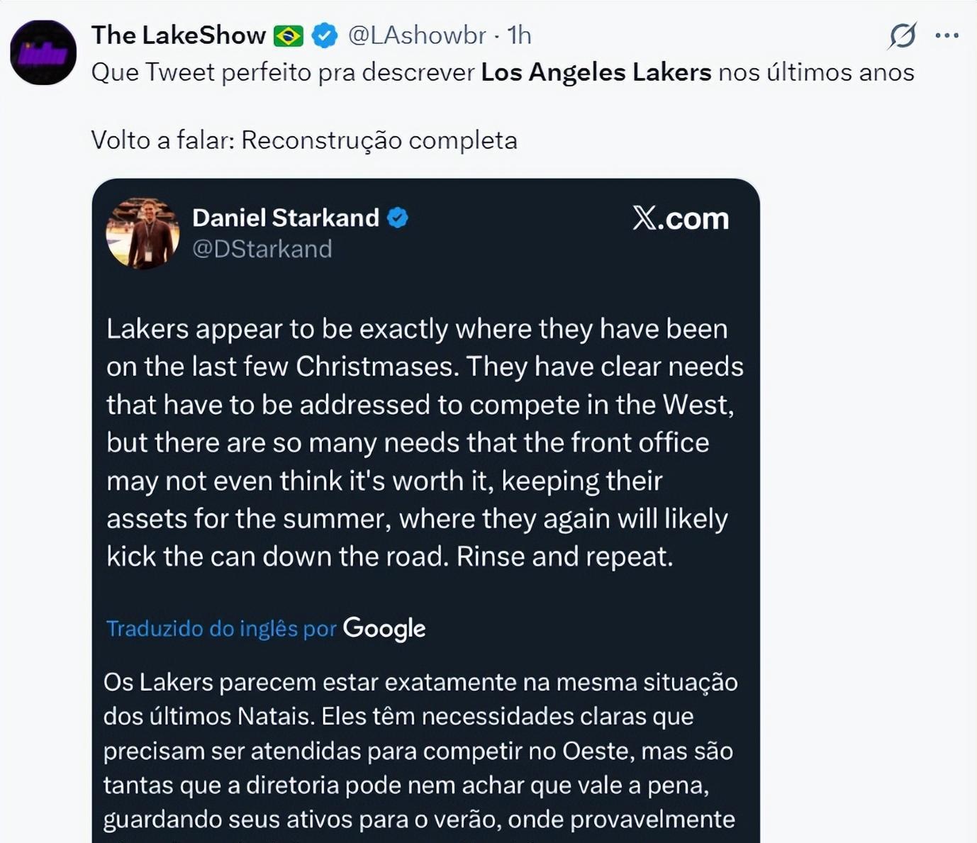 湖人记者Daniel StarKand在一年之前的年终大战前就说过湖人早该全面重建,一年后他再次提到湖人该全面重建:湖人的问题似乎跟去年年终大战前一模一样,他们有明确的需求想在西部竞争,但管理层认为补强竞争有些不值得,他们还是想留资产到夏天,以此循环往复,都没有任何的实质性改变。
