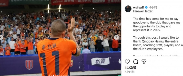 直播吧12月28日讯 今天,韦林顿·席尔瓦更新社媒,向青岛海牛俱乐部和球迷告别。