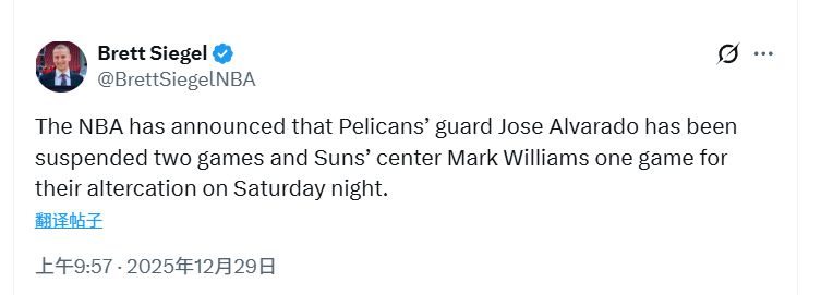 北京时间12月29日,NBA官方公布了昨日冲突的罚单,鹈鹕后卫阿尔瓦拉多禁赛两场,太阳中锋马克-威廉姆斯禁赛一场。
