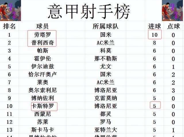 射手榜方面,劳塔罗今天虽然错失了空门,但还是传射建功造2球,他也终于是让意甲本赛季有人进球上双,10球继续领跑。普利西奇8球位列第2,霍伊伦,恰尔汗奥卢,莱奥等人6球并列第3。卡斯特罗打入一球后,追上苏莱,斯卡马卡等人5球刚好挤入前十。
