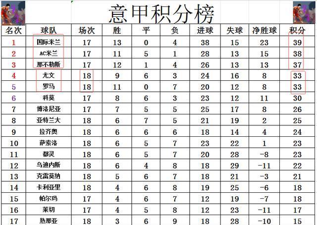积分榜方面,国米主场轻取博洛尼亚后,又是以1分优势超过AC米兰,夺回榜首。那不勒斯也不甘示弱,完胜拉齐奥后,也还是1分之差紧追AC米兰,领先第4的尤文,第5的罗马4分,坐稳第3的位置。
