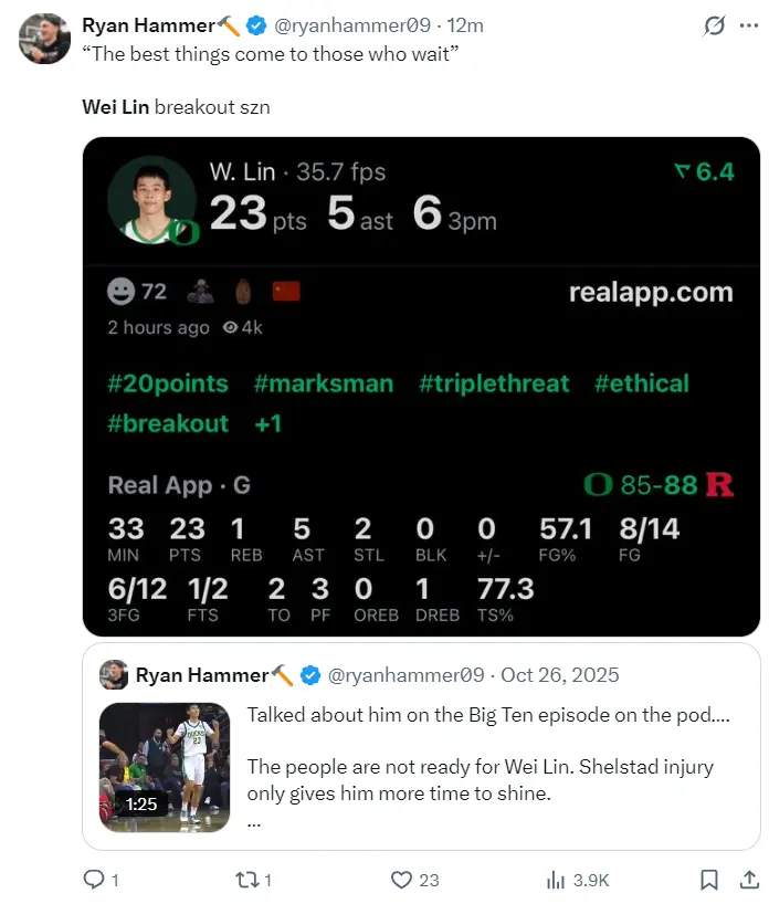 NCAA记者瑞安、哈穆尔写道:最好的事物总是降临于那些耐心等待的人,这是林葳的突破之作。(这位记者在林葳加盟俄勒冈时就开始关注他)