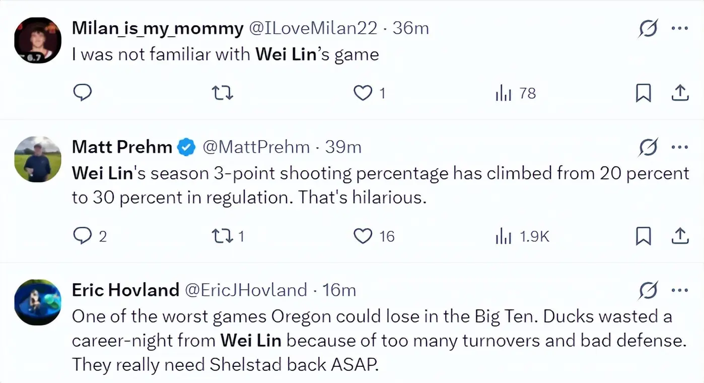 俄勒冈大学在赛后也晒出了林葳绝平的三分点赞,这个球林葳已经完全失去了节奏,他虚晃后直接干拔三分命中,他帮助球队拖入了加时赛,只可惜加时赛队友们接连的拉胯,最终俄勒冈惜败,林葳真的尽力了。