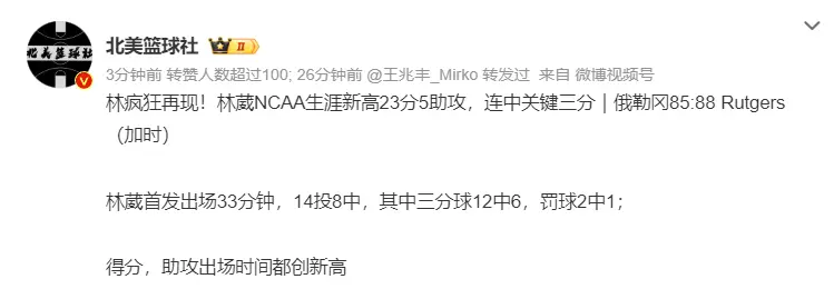 国内媒体:林葳可以说完全适应了NCAA教练对他的要求,更找到了自己在队内的角色,后面的比赛就是不断巩固自己的表现,肯定会继续给大家带来惊喜的。
