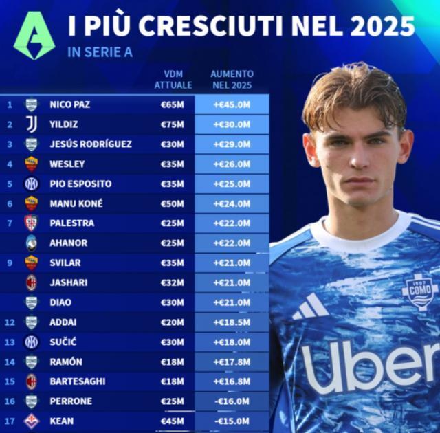 近期,《转会市场》网站公布了意甲2025自然年里,身价升值最快的20位球星。国米的皮奥升值2500万排在第5,苏契奇升值1800万排在第13,博尼升值1500万排在并列第17。