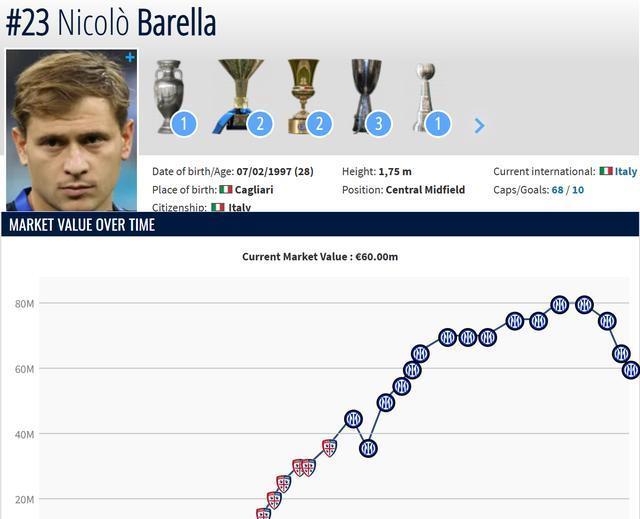 类似的事情,国米并不陌生——几年前,20出头的巴斯托尼刚刚开始在意大利队摸爬滚打时,他在《转会市场》的估价,也是1年内提升了2000万以上。如今,26岁的巴斯托尼估价是8000万欧元,在队内排名第二,仅次于队长劳塔罗(8500万)。