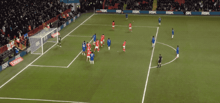 上半场补时第2分钟,吉滕斯连续横向盘带后,同样选择远射,门将迅速倒地完成扑救。