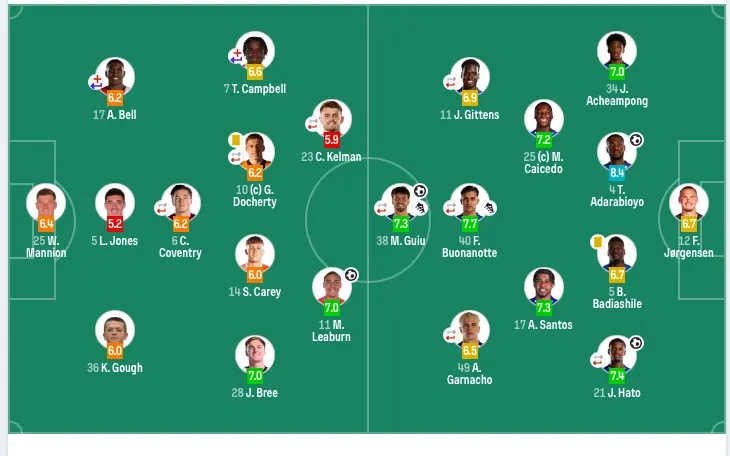 切尔西首发:12-约恩森、34-乔什·阿昌庞、4-阿达拉比奥尤、5-巴迪亚西勒、21-哈托(83’29-福法纳)、25-凯塞多、17-桑托斯、11-吉滕斯(67’41-埃斯特旺)、40-博纳诺特(69’8-恩佐)、49-加纳乔(83’7-内托)、38-吉乌(69’9-德拉普)。