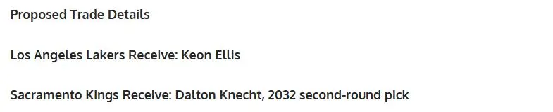 糟糕的表现,也让克内克特时常陷入交易传闻当中。这不美媒《Fadeaway World》建议湖人、国王做一笔2换1交易。具体为湖人送出克内克特、32年次轮得到基隆·埃利斯。