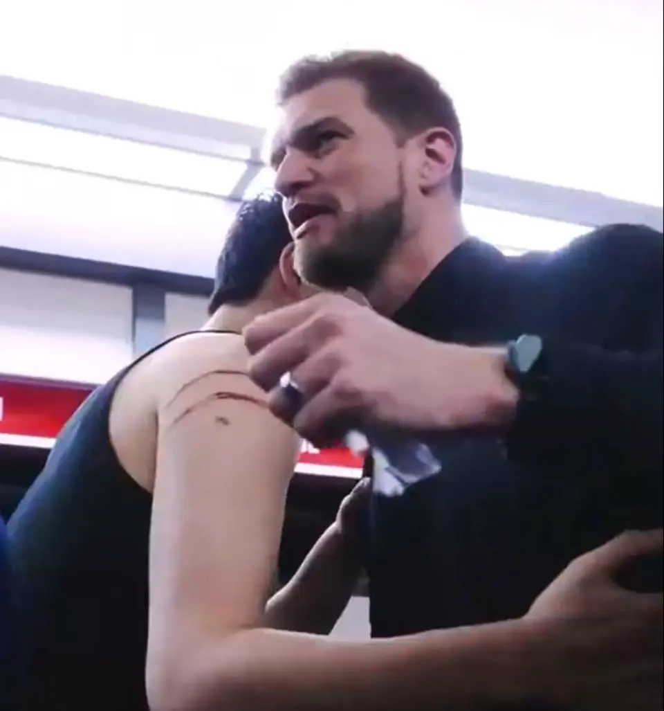 在更衣室的庆祝环节中,一个细节被随队记者的镜头敏锐地捕捉到。当斯普利特与获得本场“最佳防守球员”殊荣的里斯拥抱致意时,一旁杨瀚森手臂上几道清晰可见的抓痕显得格外刺眼。杨瀚森这些伤痕是在此前首场对阵火箭首场比赛时,与对方内线“海王”亚当斯肉搏留下的印记。这些触目惊心的红印,无声地诉说着这位中国年轻中锋在NBA禁区生存的不易。在这个肌肉丛林的联盟里,没有谁会因为你是新秀而手下留情,每一次卡位、每一个篮板都需要用身体去硬扛,这一切正在成为杨瀚森适应美职篮强度的必修课。