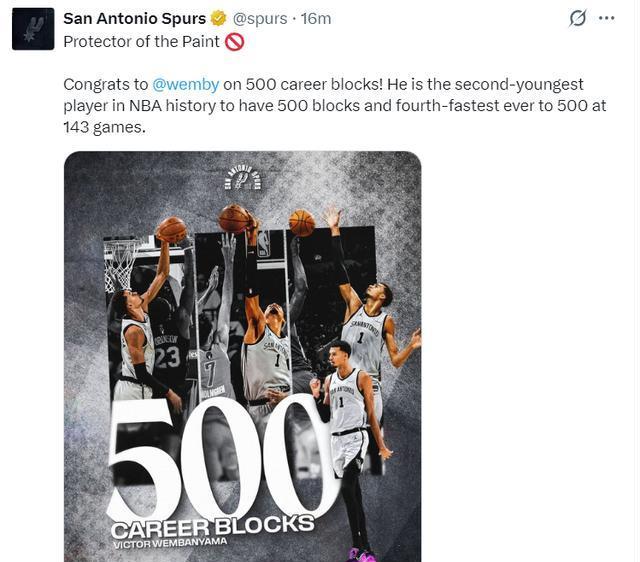 文班亚马达成生涯第500次封盖历史第二年轻,他仅用143场是历史第四快。