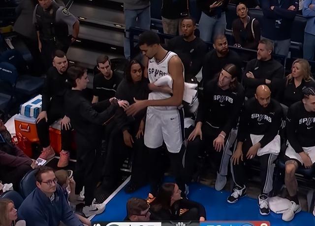 第三节亚历山大被文班亚马制造进攻犯规,文班亚马的膝盖被撞只能下场检查休息。