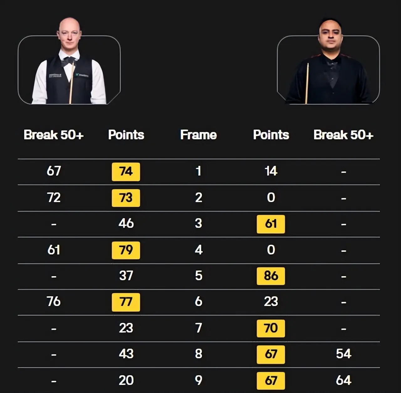比赛的前六局,韦克林4-2领先,并且先后打出了四杆50+(67、72、61、76),辛格·查达则是一杆50+都没有,韦克林率先拿到了多个赛点,再赢一局就能晋级。应该说,这种局面是外界所预期的。