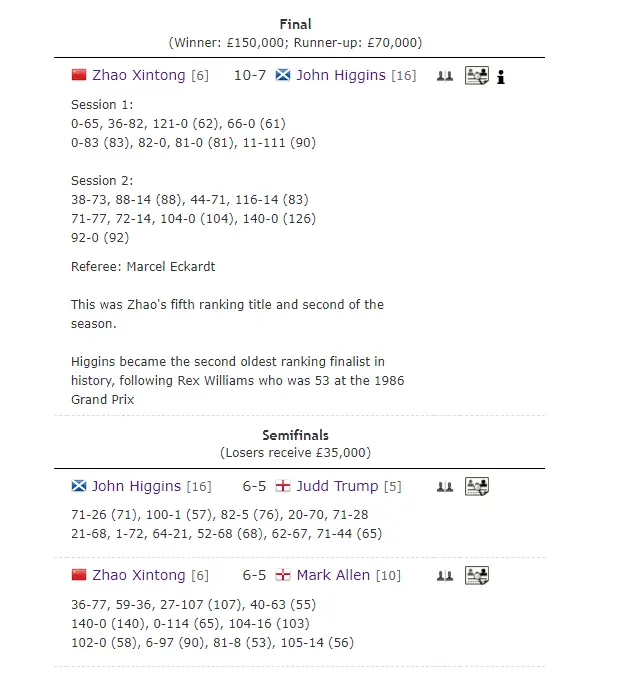 经过激烈争夺,赵心童、希金斯,与世界第一“准度王”贾德-特鲁姆普、“小钢炮”马克-艾伦打进四强。半决赛,赵心童对阵艾伦,希金斯迎战特鲁姆普。