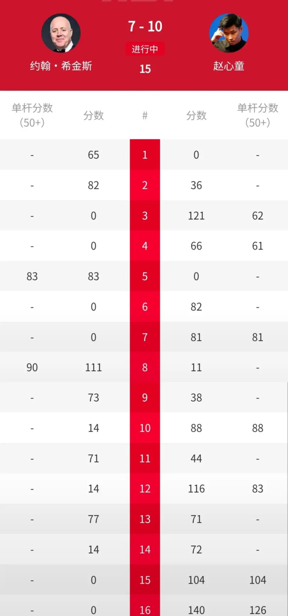 最终的决赛,赵心童与希金斯在第一阶段打得势均力敌,以4-4战成平局。第二阶段,双方开局也是非常胶着,但从第十四局开始,赵心童强势发力,他轰出四连鞭,总比分10-7战胜希金斯夺得冠军,同时收获140万人民币的冠军奖金,祝贺赵心童!