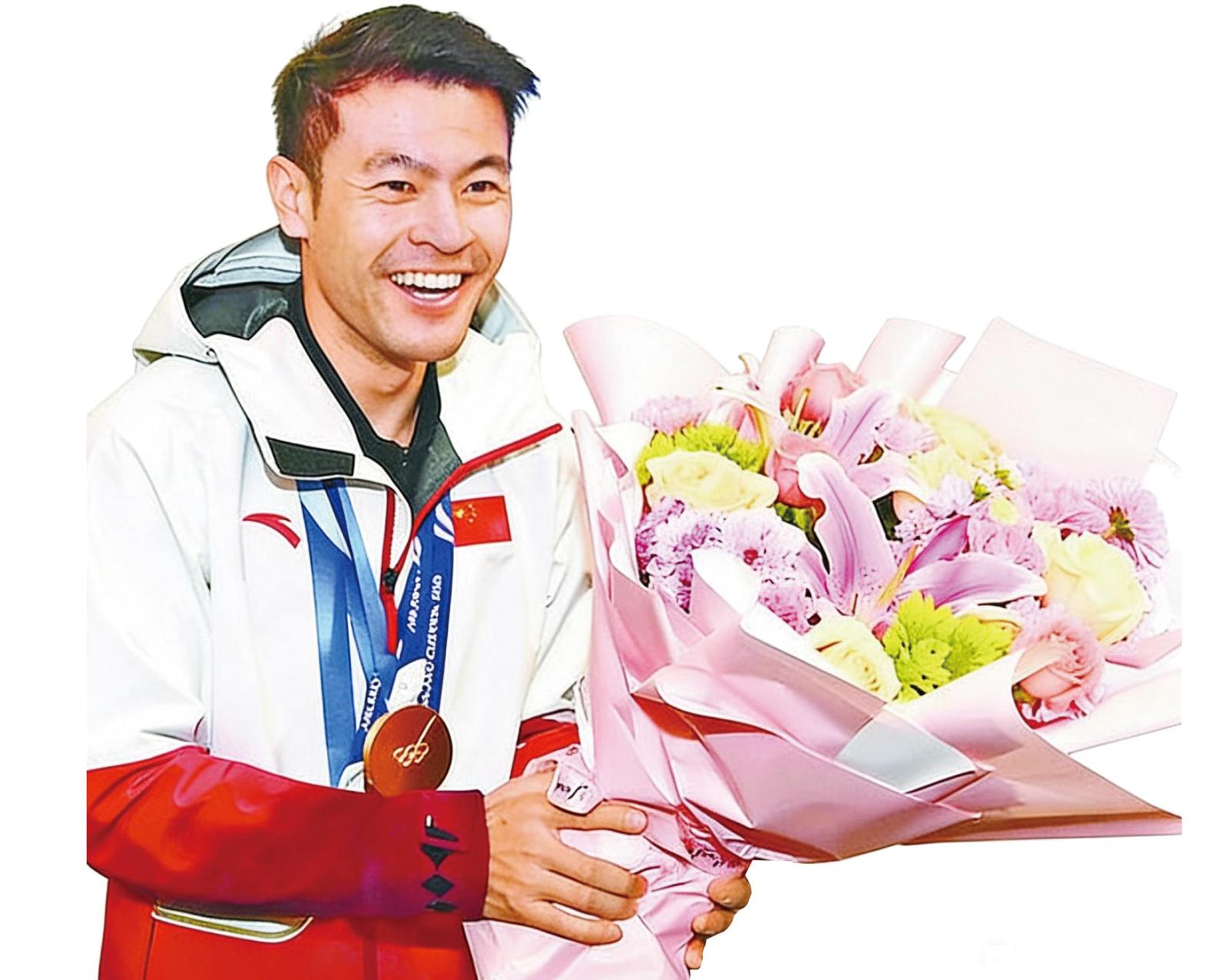 米兰冬奥会速度滑冰男子1500米金牌得主宁忠岩载誉归来。纪勇摄
