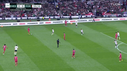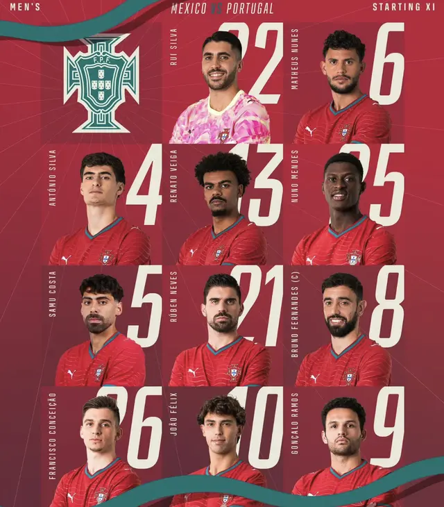 在葡萄牙队的首发阵容中,4231阵型,门将鲁伊席尔瓦,门德斯、韦加、安东尼奥席尔瓦以及努内斯组成后卫线,科斯塔跟鲁本内维斯双后腰,前腰B费,代替C罗戴着队长袖标,左边锋菲利克斯,小孔塞桑在右路,中锋拉莫斯。墨西哥队这边4141阵型,守门员兰赫尔,后卫加利亚多、巴斯克斯、蒙特斯以及雷耶斯,后腰利拉,身前4人包括古铁雷斯、巴尔加斯、菲达尔戈、阿尔瓦拉多,希门尼斯突前。