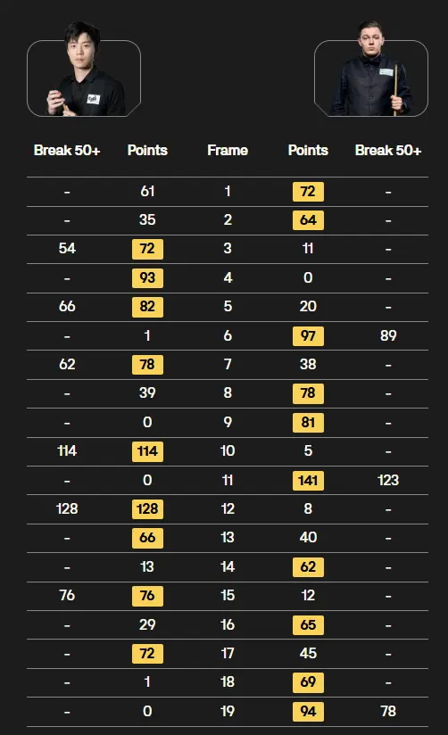 其中,排名赛3冠王傅家俊的对手是女子世锦赛冠军明克-努查鲁特。这场比赛第一阶段,傅家俊以4-0的比分梦幻开局,对手随后追成1-4,傅家俊接下来又连赢4局。这个阶段,傅家俊轰两杆破百和两杆50+,对手努查鲁特没有打出一杆50+以上的表现。