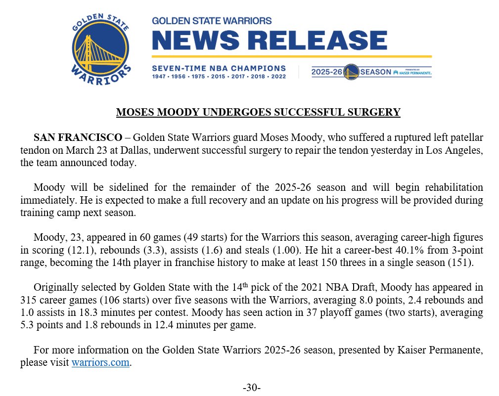 北京时间3月29日,NBA勇士队官方宣布,穆迪成功接受膑腱修复手术,将进行完全康复,预计下赛季训练营期间更新伤情。