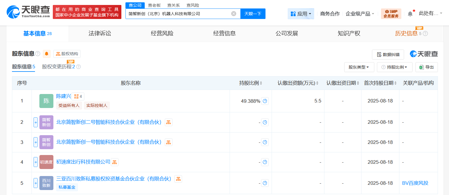 近期,简智新创(北京)机器人科技有限公司的企业工商信息发生重要变动,两大新股东加入其股东行列。据天眼查数据显示,百度旗下的三亚百川致新私募股权投资基金合伙企业(有限合伙)以及初速度出行科技有限公司正式成为该公司的股东成员。