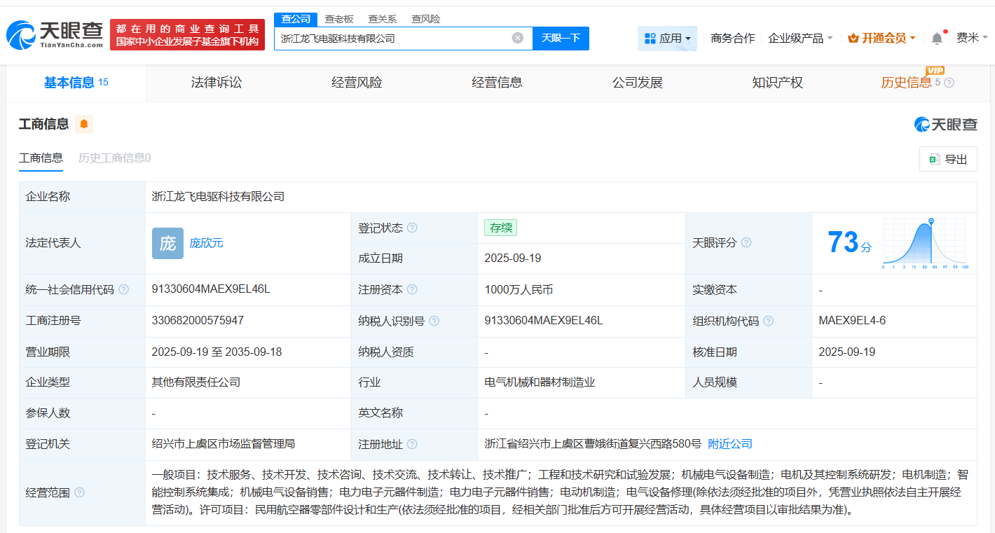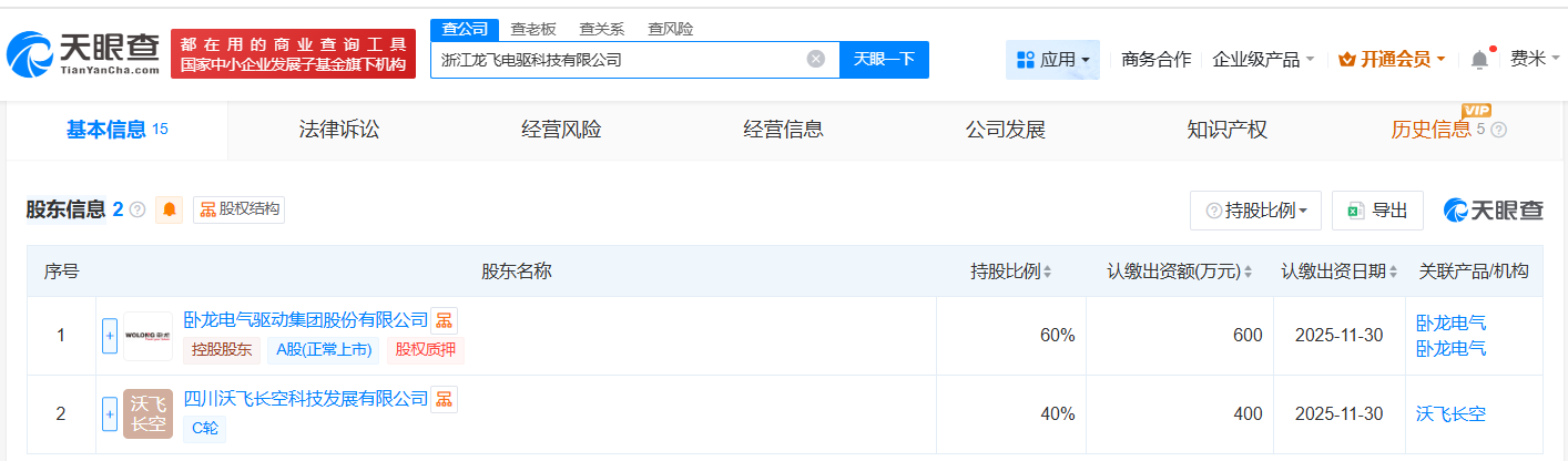 天眼查App显示,近日,浙江龙飞电驱科技有限公司成立,法定代表人为庞欣元,注册资本1000万人民币,经营范围包括工程和技术研究和试验发展、机械电气设备制造、电机及其控制系统研发等。股东信息显示,该公司由卧龙电驱(600580)、四川沃飞长空科技发展有限公司共同持股。