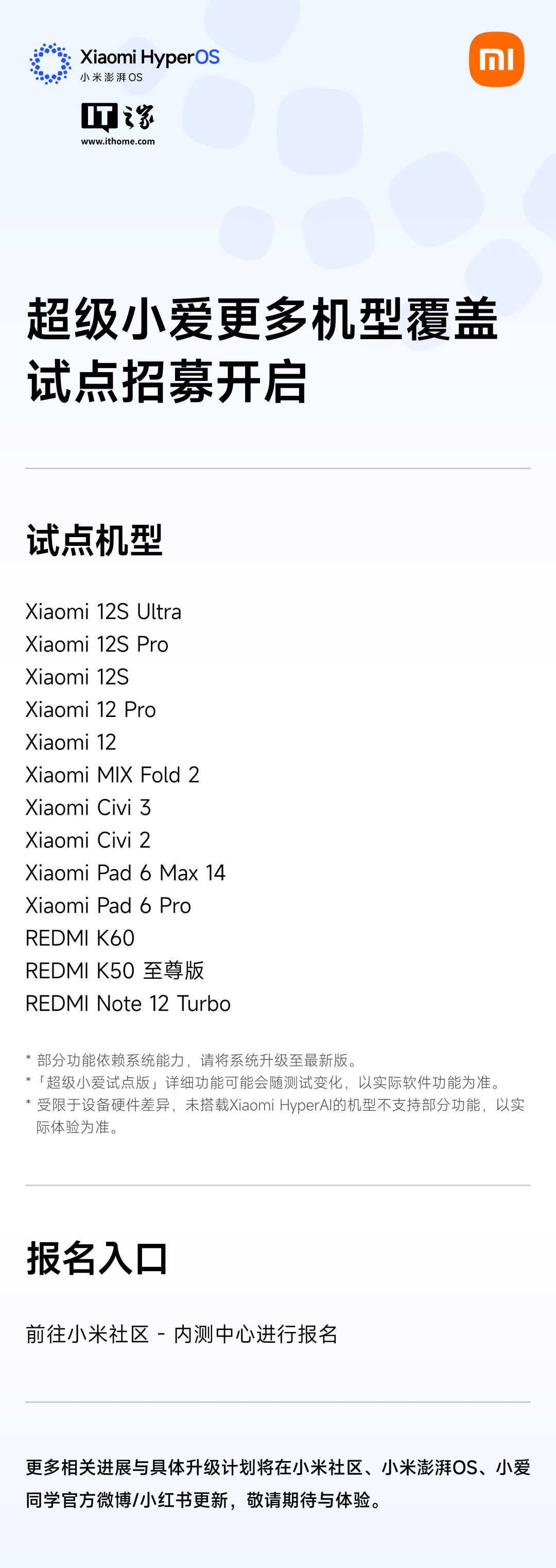 IT之家附「超级小爱更多机型覆盖试点招募」公告如下: