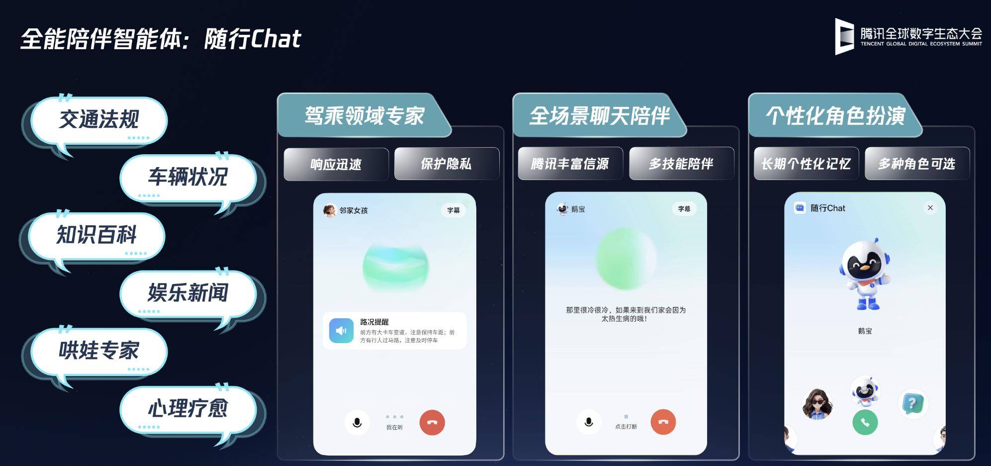 有很多内容和服务的组件它原本就在,但是它缺少被用户用语音的方式启动,或者符合场景的方式去调度。我们用 AI 化的方式就完成了这一点,既清晰知道你的地点,知道你的路线,知道你什么时间可能到达哪个地方,这个时候我需要在那个地方提前或者是预约某一个时间,点一杯咖啡或者是点一个座,它都可以帮你去做到。当然这个也结合腾讯很重要的优势,我们有广泛的小程序生态。而且我们车端在很早之前就已经成熟化完成小程序框架,因为框架以及小程序本身就是现成的,我们结合 AI 时代之后,我们让大模型再结合更多的 Agent 的调用,使得它获得更完美的体验。