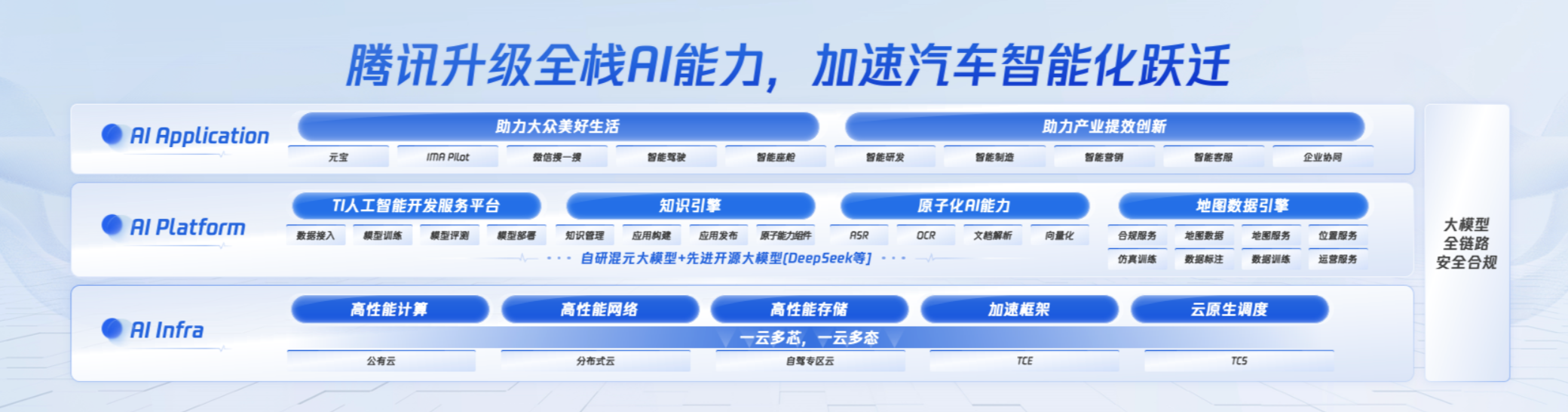 可实现场景与意图的精准理解,并通过自研端云模型协同策略,达成快速响应,意图理解时延小于 500 毫秒、准确率超 95%。AI agent 架构支持微信小程序、LBS、联网搜索等丰富信源扩展和腾讯生态能力,车企与第三方可通过标准化接口轻量接入智能体开发。