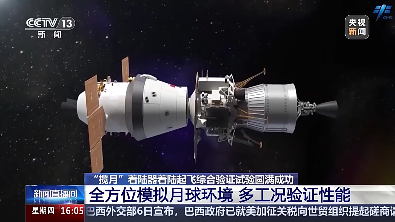 揽月着陆器由登月舱和推进舱组成,两舱在动力下降过程中分离推进舱,登月舱单独落月,完成月面任务后,整体起飞。此轮着陆起飞综合验证试验,对任务实施中的飞行过程进行了1∶1的验证。