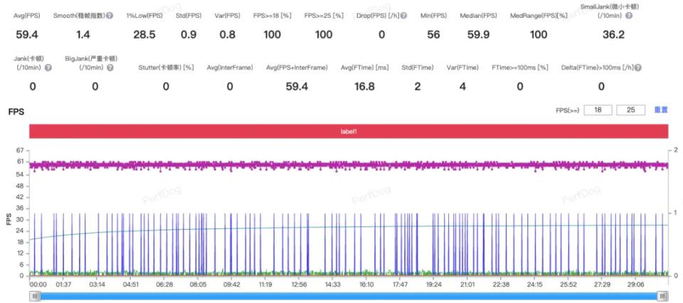 平均帧率达到 59.4 帧,平均功耗 6.8W。
