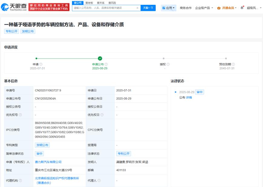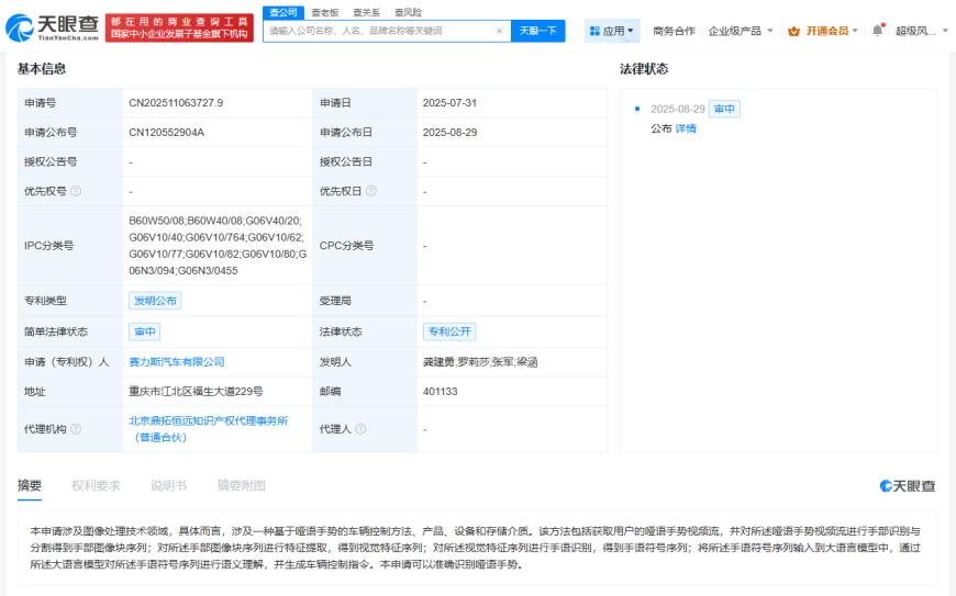 天眼查显示,近日,赛力斯汽车有限公司申请的“一种基于哑语手势的车辆控制方法、产品、设备和存储介质”专利公布。