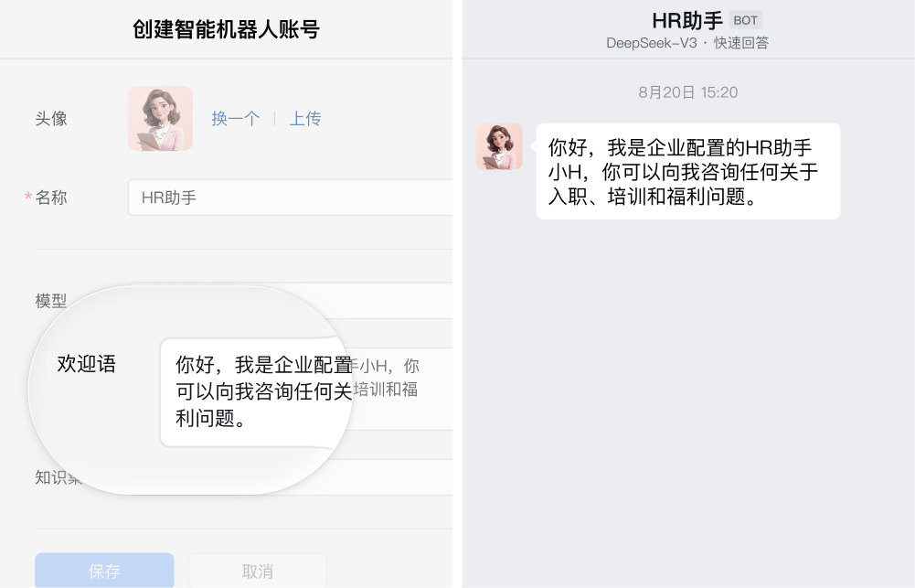 - 进入机器人会话时,支持发送欢迎语,更好地介绍机器人、引导员工提问等。