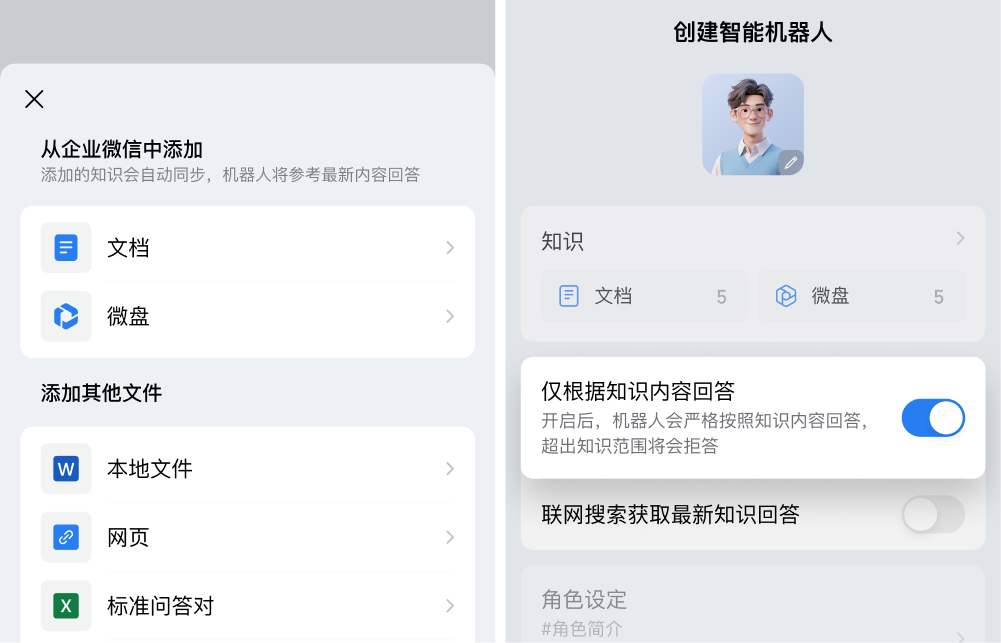 - 可以将企业微信文档、微盘空间中的业务知识添加到机器人,让回答更精准,还支持本地文件、问答对、API 等多种方式添加知识。