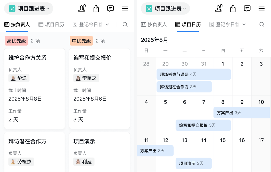 - 可以通过看板视图快速推动任务流转,也可以通过进度甘特图来了解项目的整体进展。
