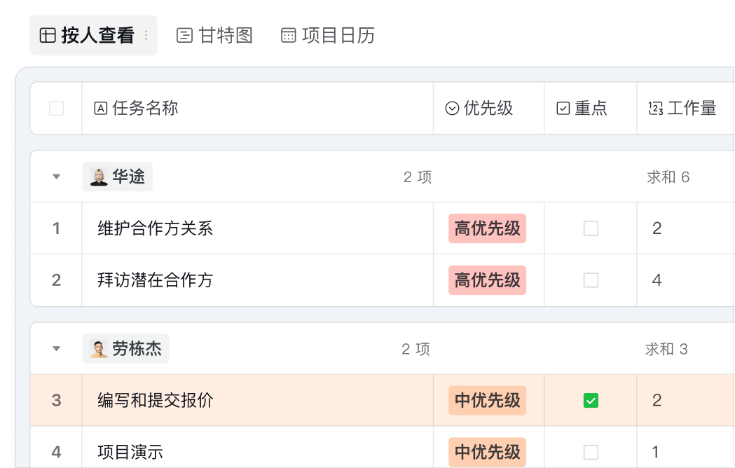 - 多视图清晰展示项目进展。可按人员分组,快速查看每个人手头上有多少工作,不同角色的成员可以在各自视图里查看和编辑,多人筛选互不干扰。